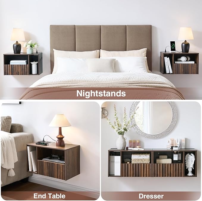 Free up floor space with BuildHom’s fluted walnut wall-mounted nightstand. At just 12.8 inches tall, it brings style without bulk. Built-in AC outlets and dual USB ports keep devices charged and cords tangle-free. A hidden drawer tucks away remotes and sleep masks, while the 21-inch top shelf holds up to 40 lbs—perfect for lamps or décor. Tool-free installation with included anchors means it also doubles as a sleek bedside shelf or entryway drop zone.