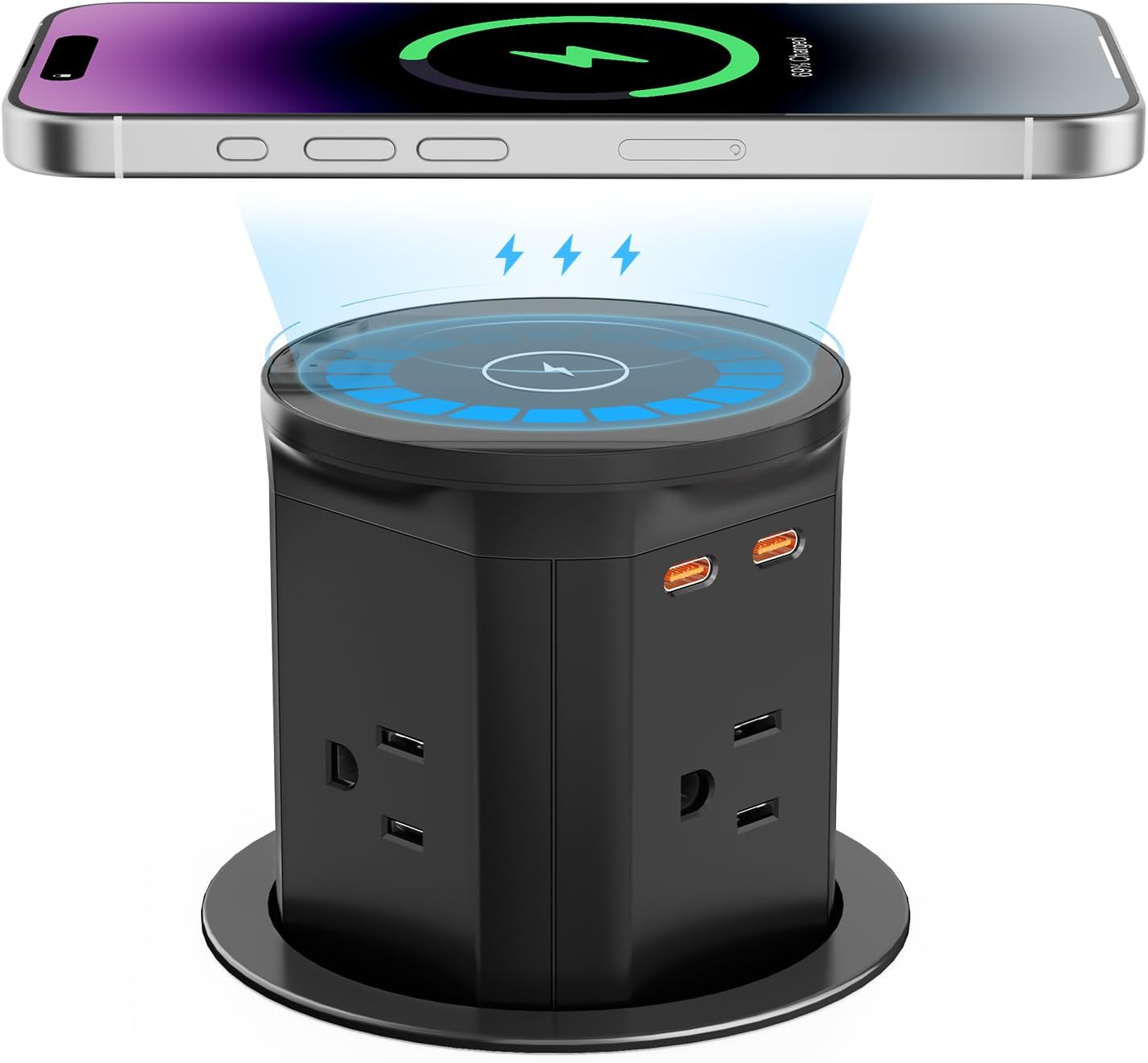 Say goodbye to tangled cords and crowded countertops. This pop-up power hub sits flush with your surface when not in use, then rises smoothly with a press to reveal standard outlets, USB charging ports, and a wireless charging pad on top. It installs neatly in desks, kitchen islands, and meeting tables to place power exactly where it is needed, without bulky strips or dangling cables. The clean design keeps spaces looking organized and modern, while offering convenient access for laptops, appliances, and mobile devices. Enjoy a clutter-free workspace or kitchen that stays polished, practical, and ready for whatever you need to plug in.